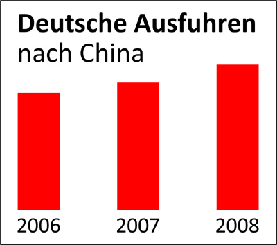 Die Außenhandelsbeziehung von Deutschland zu der VR China in Mrd. Euro: 2006: 27,48; 2007: 29,90; 2008: 34,10